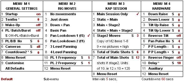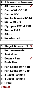 2 Rig Moves Menu for rigs utilising infrared shutter control and having both pan and tilt servos. This menu offers:-